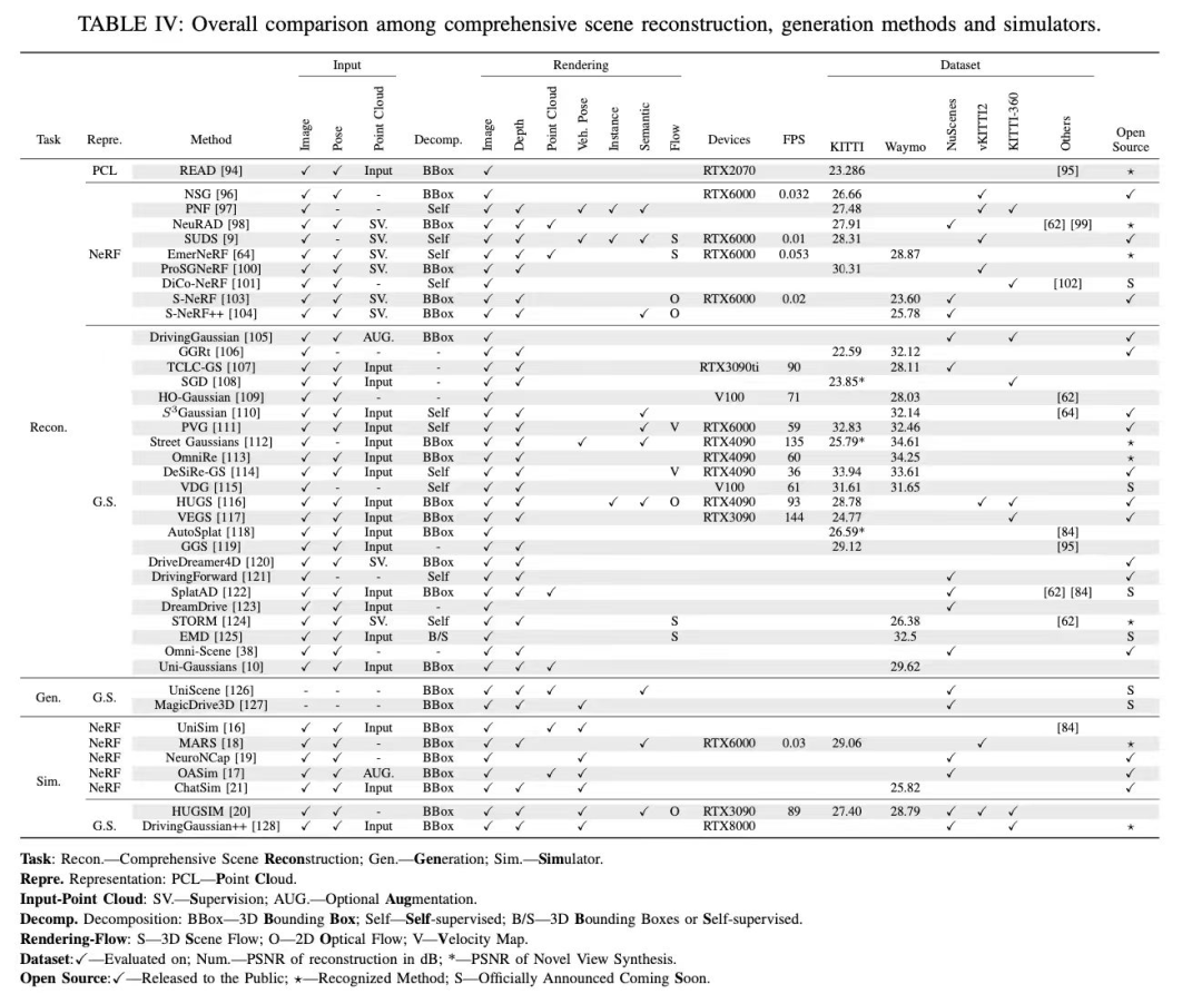 尽管相关研究呈指数增长,但现有综述往往局限于单一技术路线(仅探讨NeRF或3DGS),或脱离自动驾驶的具体语境(如多聚焦于室内小物体重建)。自动驾驶场景具有其独特性与复杂性:涵盖大规模无界场景、极度稀疏的传感器视角、以及包含大量高速运动的刚性或非刚性交通参与者。当前文献尚缺乏一项从自动驾驶真实需求出发,梳理从静态背景到动态场景,再到下游应用(如感知增强、闭环仿真、世界模型)的系统性研究。行业亟需一份能够衔接前沿图形学技术与自动驾驶工程实践的综合指南。