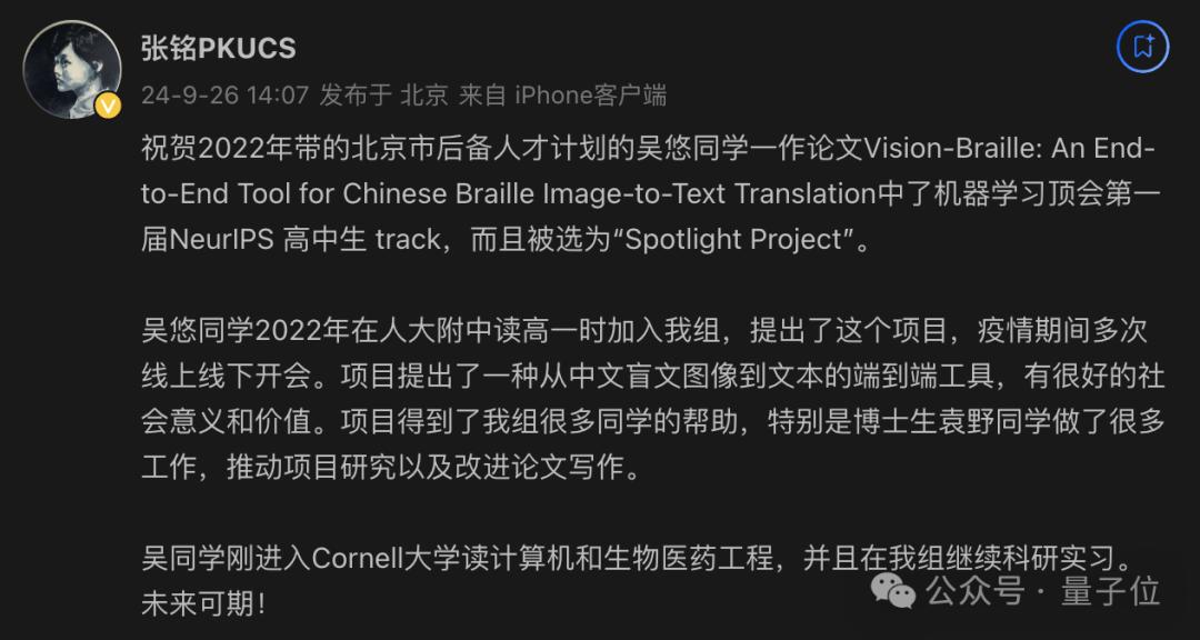 该项目是在吴悠高三时完成。张铭教授透露,他目前已进入康奈尔大学就读计算机和生物医药工程专业。