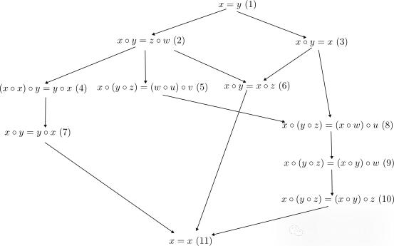 例如,等式1可以推导出这个列表中的所有其他公理,而这些公理又可以推导出等式11。