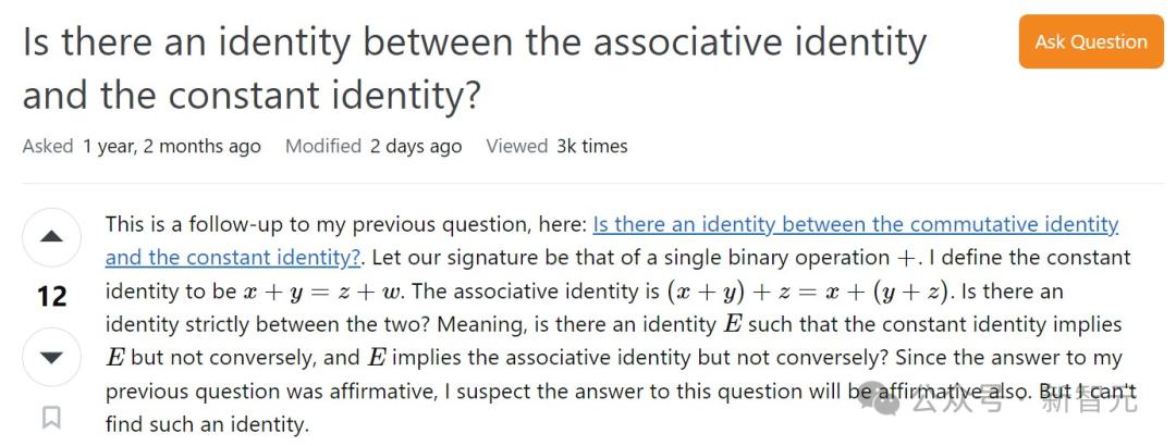 这一结果特别回答了数学问答网站MathOverflow上的一个问题:是否存在介于常数公理(等式1)和结合律公理(等式10)之间的等式公理(equational axioms)。