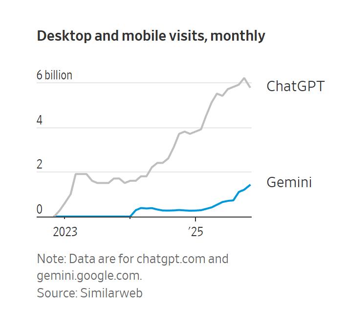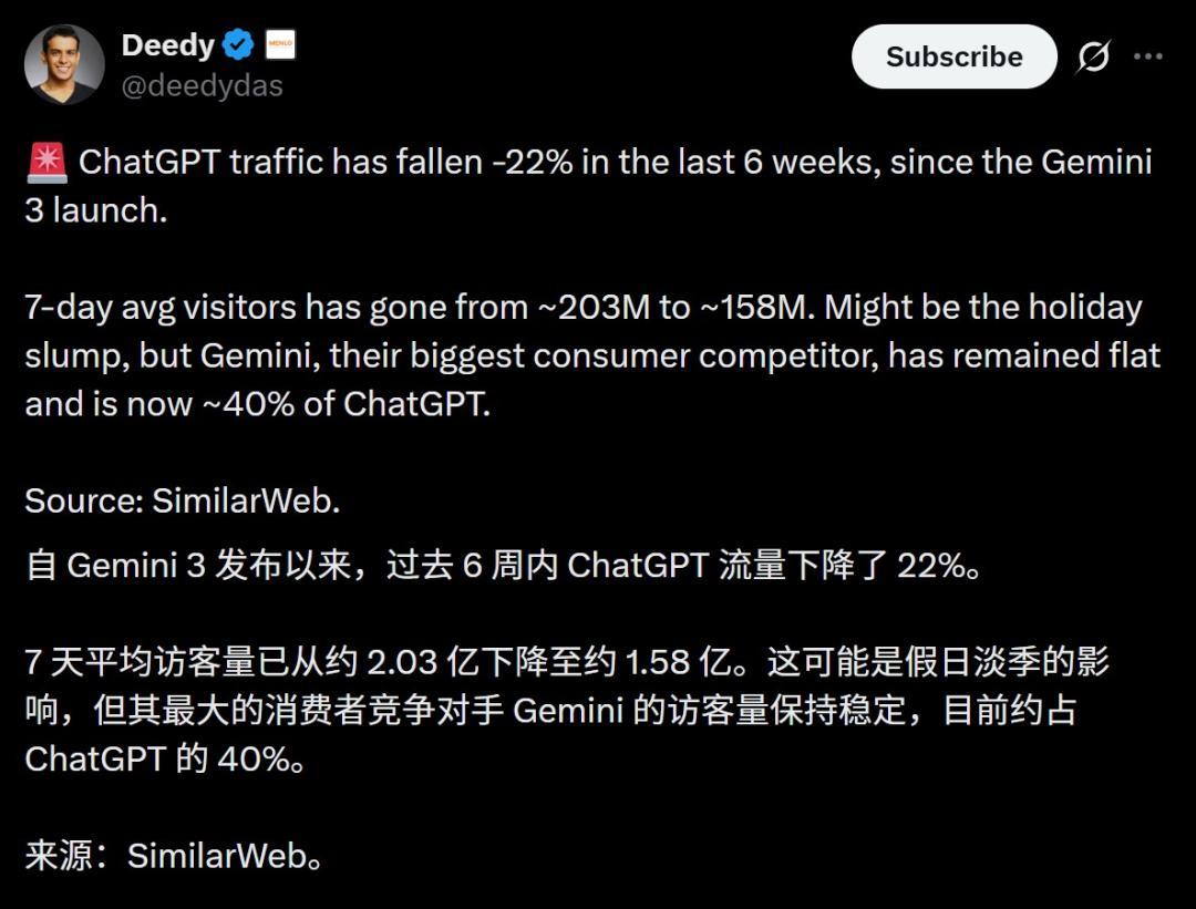 自去年11月谷歌发布Gemini 3 Pro以来:ChatGPT网站流量骤降,Gemini的网站流量则快速上升。