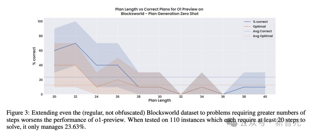 虽然o1和o1-mini都取得了不错的成绩,但性能并不稳健。随着任务逐渐复杂、计划步骤增加,性能会出现直线下降。