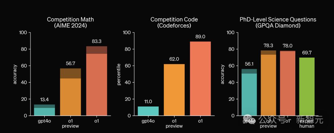 这个结果也和OpenAI自己放出的测试结果相吻合,尤其是在AIME和Codeforces这类难度更高的基准上,o1-preview相比GPT-4o的提升更加明显。