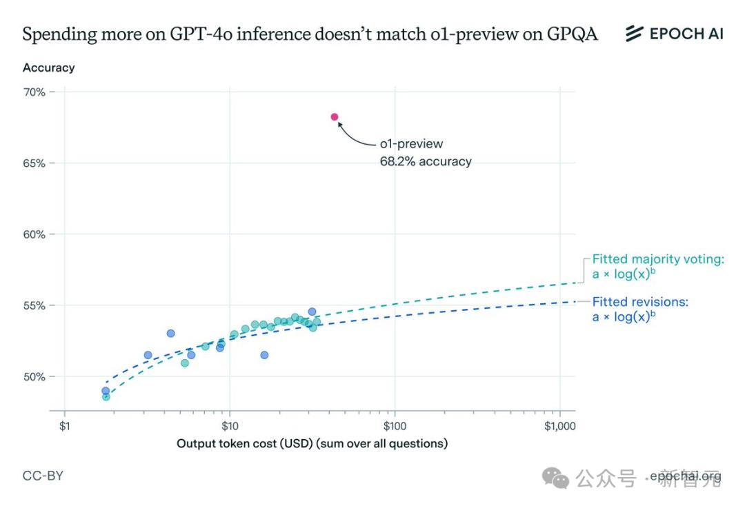 Epoch AI团队的推算结果表明,即使在GPT-4o上花费1000美元用于输出token,准确率仍将比o1-preview低10多个百分点。