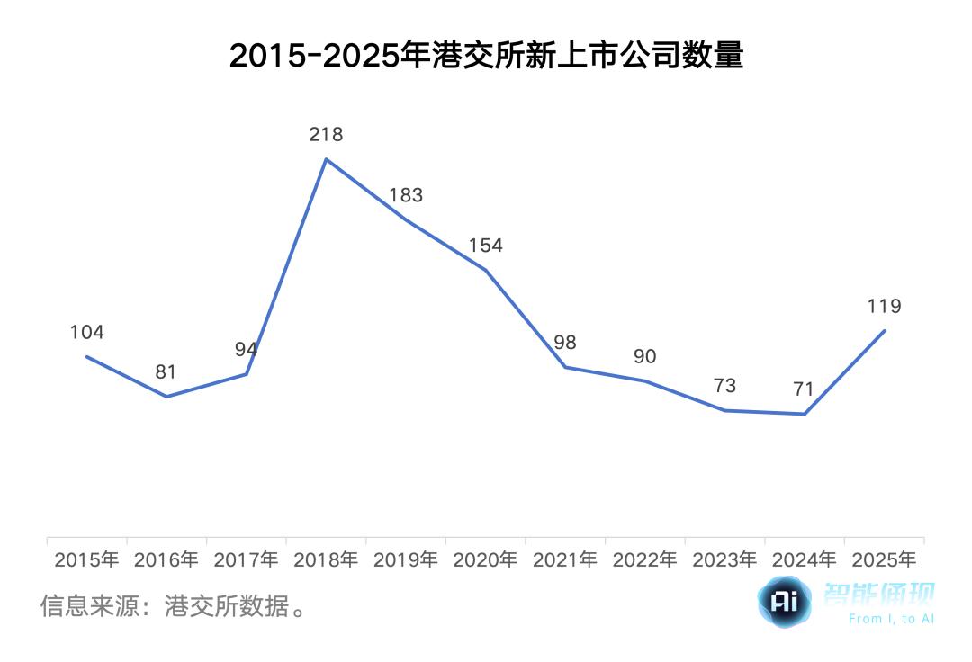△2015-2025年港交所新上市公司数量。图源:智能涌现制图
