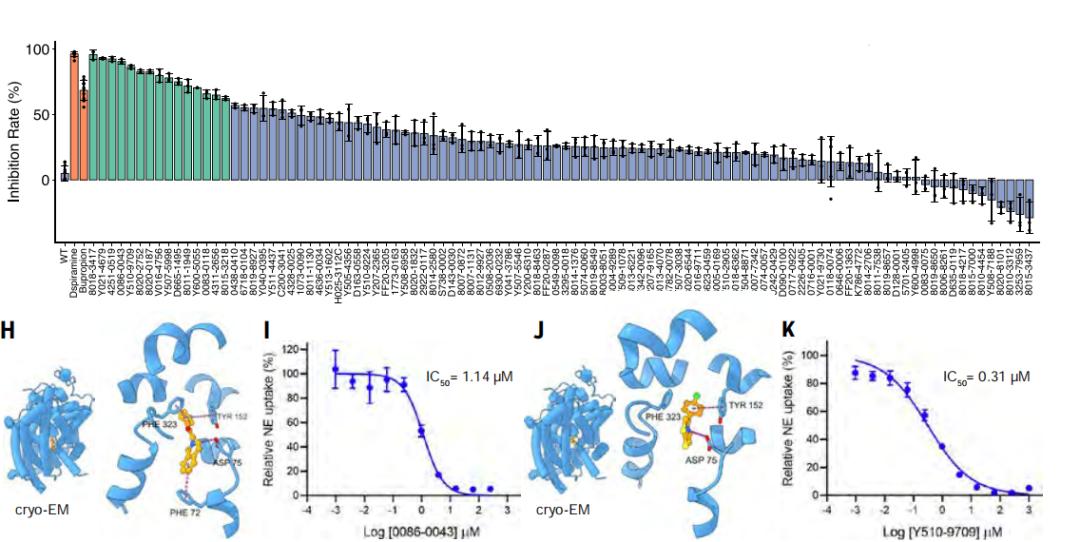 在湿实验中,DrugCLIP 针对去甲肾上腺素转运体取得了15% 的命中率,并成功解析了两种筛选得到的抑制剂与靶蛋白的复合物结构。对于甲状腺激素受体相互作用因子 12(TRIP12)这一缺乏全配体结构和小分子结合物的靶点,DrugCLIP 仅依赖 AlphaFold2 预测结构便实现了17.5% 的命中率。