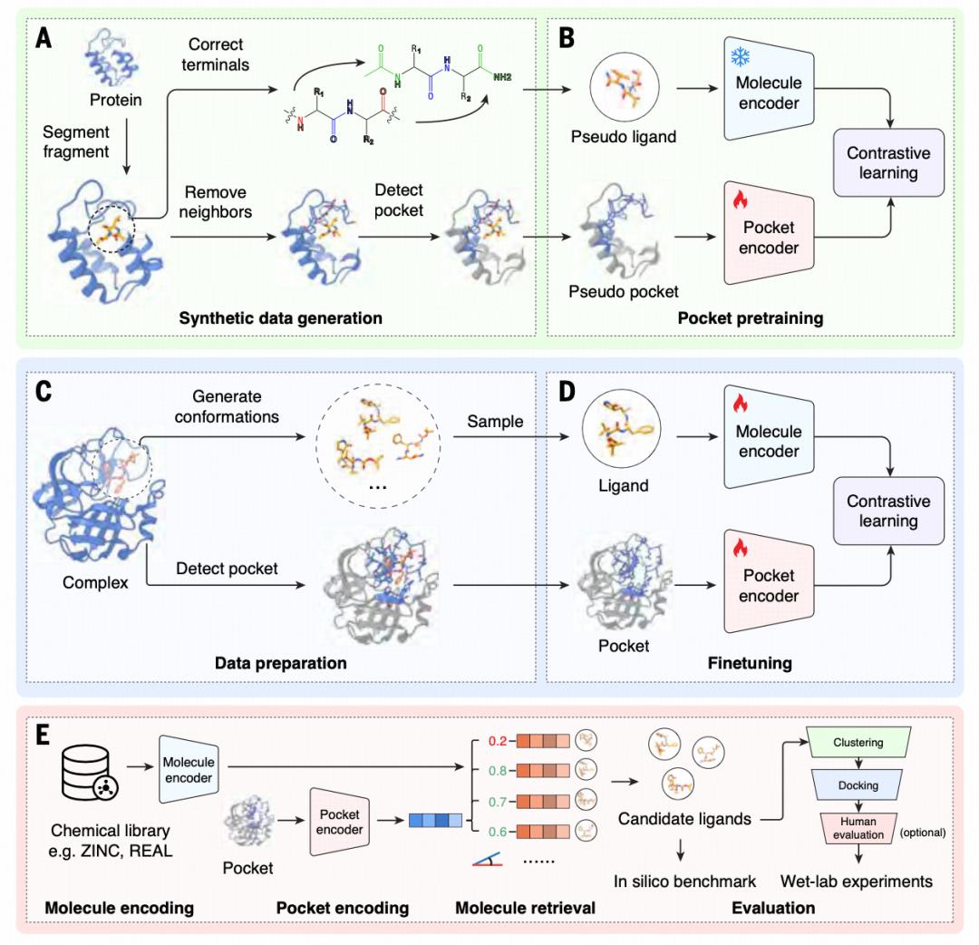 该框架将蛋白内部的短肽片段视作“伪配体”,其周围区域视作“伪结合口袋”。由于蛋白内部相互作用与蛋白–小分子结合在物理机制上高度相似,这种方式可以在没有真实配体的情况下,让模型提前学习结合规律。