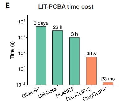 在对包含约 264 万个分子的 LIT-PCBA 数据集进行筛选时,传统分子对接软件 Glide-SP 需耗时约3 天,而 DrugCLIP 在顺序计算模式下仅需 38 秒;在使用 GPU 并行计算时,完成相同计算量所需时间更仅为 0.023 秒。