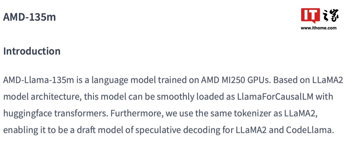 IT之家 9 月 29 日消息,AMD 在 Huggingface 平台公布了自家首款“小语言模型”AMD-Llama-135m,该模型具有推测解码功能,拥有 6700 亿个 token,采用 Apache 2.0 开源许可,IT之家附模型地址如下(点此访问)。