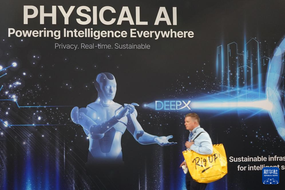 1月7日,一名男子在2026年美国拉斯维加斯消费电子展上走过印有“物理AI”字样的展台。 新华社发(曾慧摄)