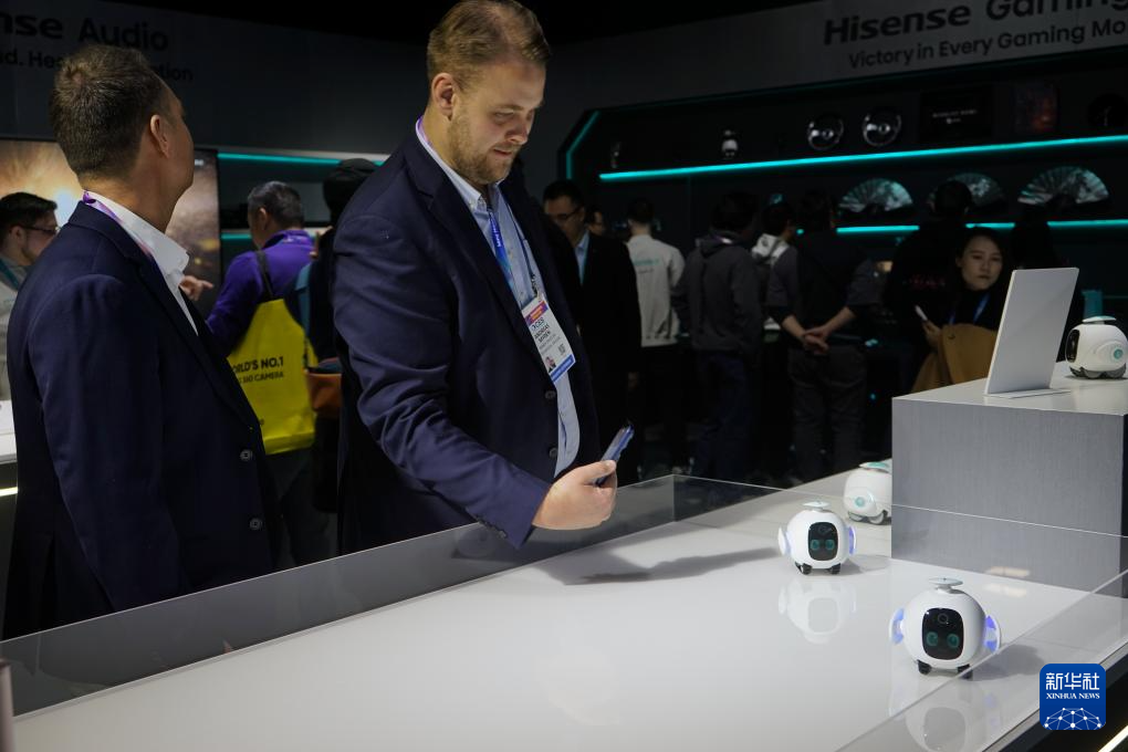1月7日,一名男子在2026年美国拉斯维加斯消费电子展(CES)海信展台观看搭载新一代AI智能识别引擎的陪伴机器人Beta。 新华社发(曾慧摄)
