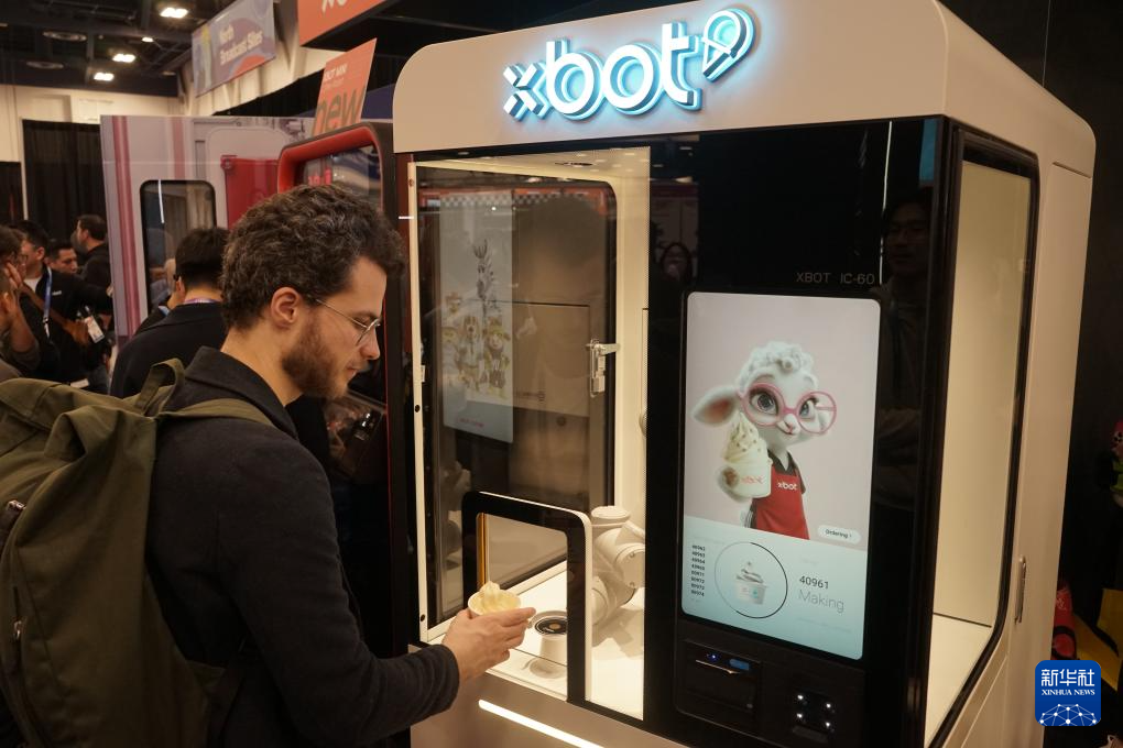 1月7日,人们在2026年美国拉斯维加斯消费电子展(CES)体验影智XBOT冰淇淋机器人。 新华社发(曾慧摄)