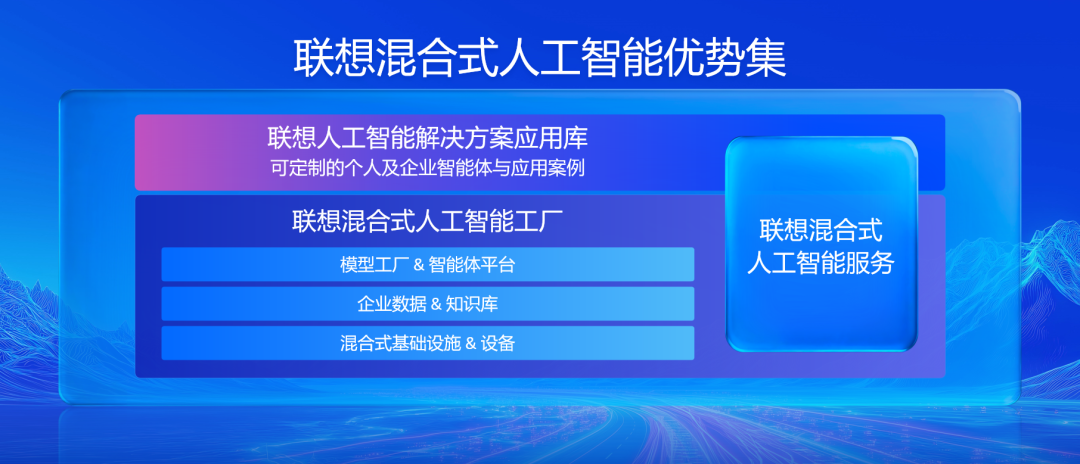 这套从混合算力供给到企业数据准备,从模型调用到智能体开发,再到形成人工智能解决方案应用库的全栈布局,被联想统称为“混合式AI优势集”。