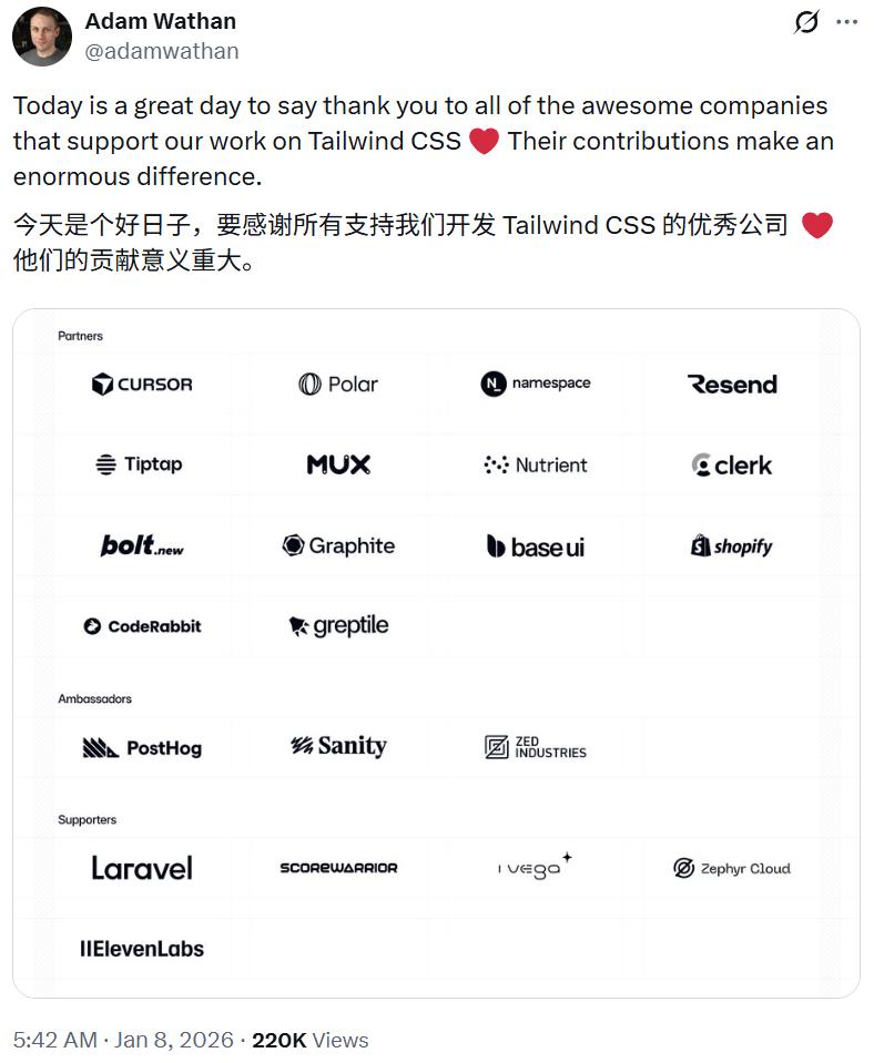 前天,Adam Wathan 就已经在 X 上晒出了一份赞助者名单,其中可以看到 Cursor、Shopify、CodeRabbit 等多家知名 AI 和科技公司。