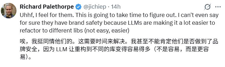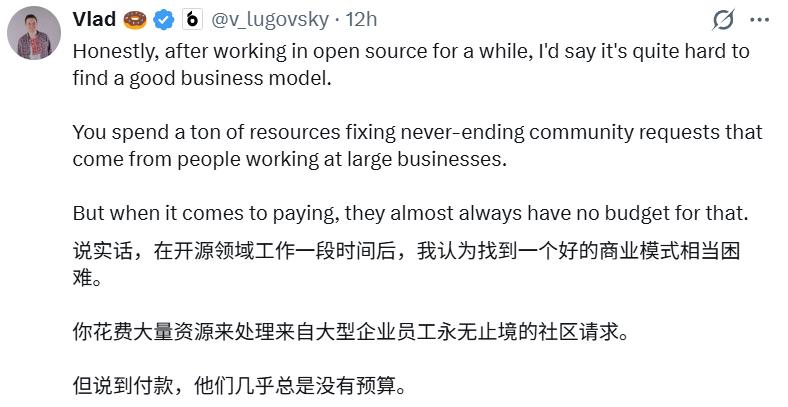 他还在这条评论中表达了担忧:「这个项目在没有人再受雇来维护它的情况下,最终只会变成一个无人维护、被遗弃的软件。」