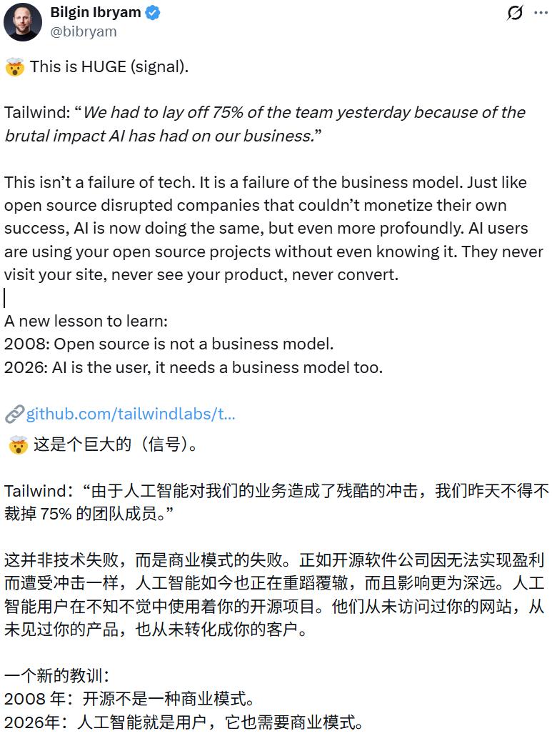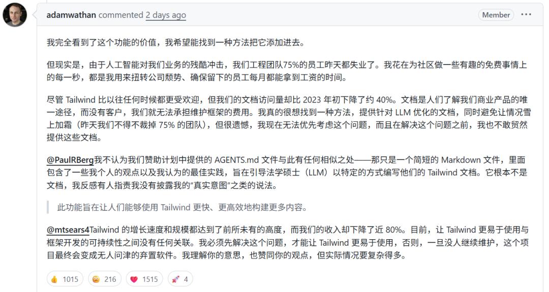 前两天,Tailwind CSS 创始人 Adam Wathan 在一条 GitHub 评论中揭示了一个辛酸的现实:Tailwind 已经裁掉了 75% 的团队成员。这并非因为产品不再流行,恰恰相反,Tailwind 比以往任何时候都受欢迎。导致这一局面的核心原因在于,AI 带来的巨大流量与商业转化彻底脱钩:AI 在写代码,就没有人类会去访问文档,也就没人为他们的付费产品买单。