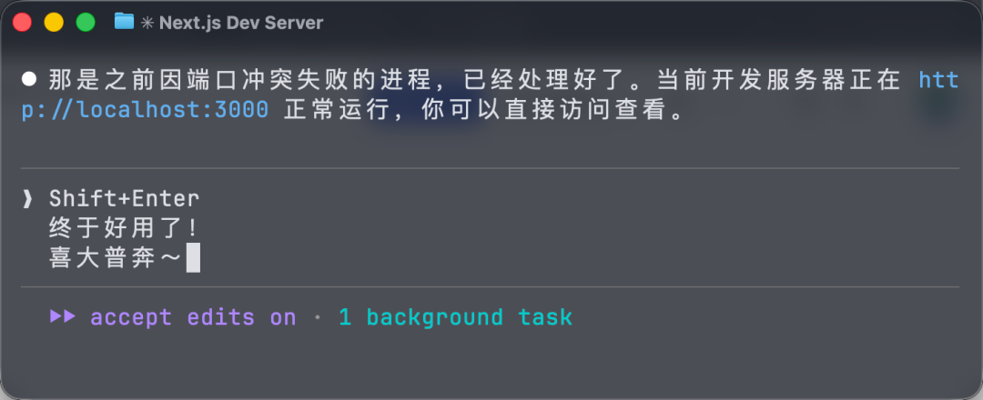 在 iTerm2、Kitty、Ghostty、WezTerm 这些终端里,Shift+Enter 多行输入开箱即用。