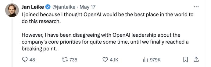 OpenAI原“超级对齐”团队负责人Jan Leike曾在X上发文:我与OpenAI领导层在公司核心优先事项上的分歧已久,最终达到了一个临界点……近年来,安全文化和流程已经让位于更为吸引人的产品。