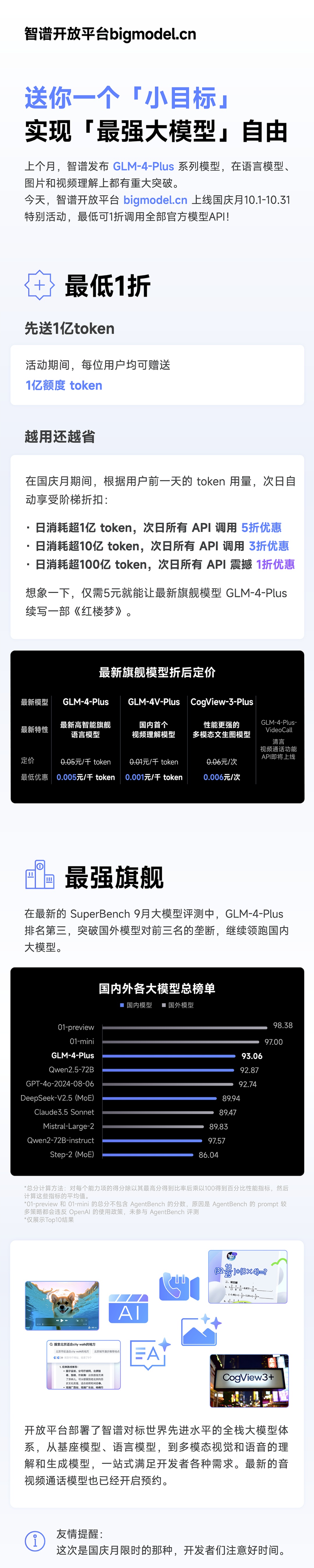 IT之家 9 月 29 日消息,智谱 AI 今天下午发布 10 月最新促销活动,最低 1 折调用开放平台 bigmodel.cn 所有官方模型 API,期间每位用户均可获赠 1 亿 tokens 额度。
