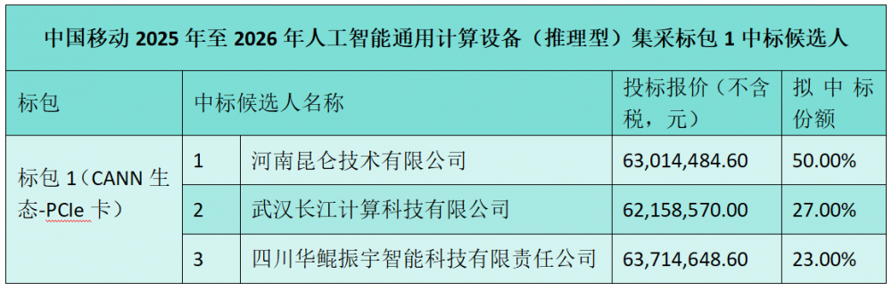 C114讯 1月12日消息(九九)中国移动采购与招标网日前发布2025年至2026年(一年期)人工智能通用计算设备(推理型)集中采购项目补充采购中标候选人公示,昆仑技术等三家中标。
