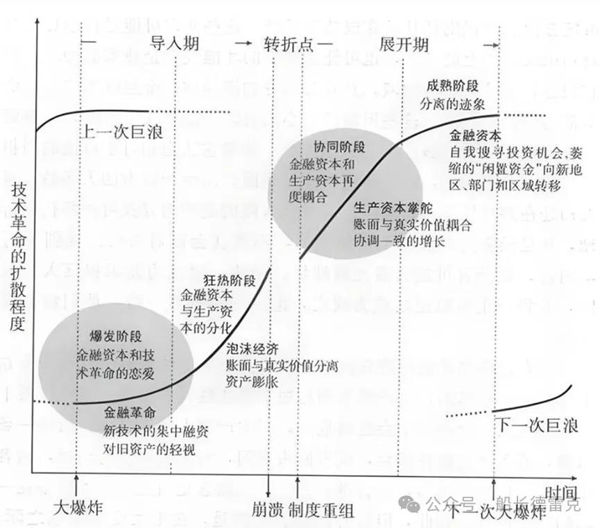 卡洛塔・佩雷斯在《技术革命与金融资产:泡沫与黄金时代的动力学》书中,详细论述在资本的影响下,新技术革命会产生一个转折点,把整个产业的普及分成泾渭分明的导入期和展开期。