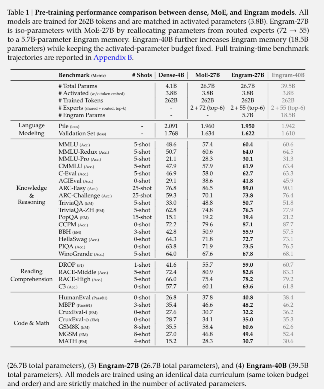 Engram-40B:进一步扩展 Engram 模块,保持专家数量不变,Engram 记忆参数增至 18.5B,总参数 39.5B。