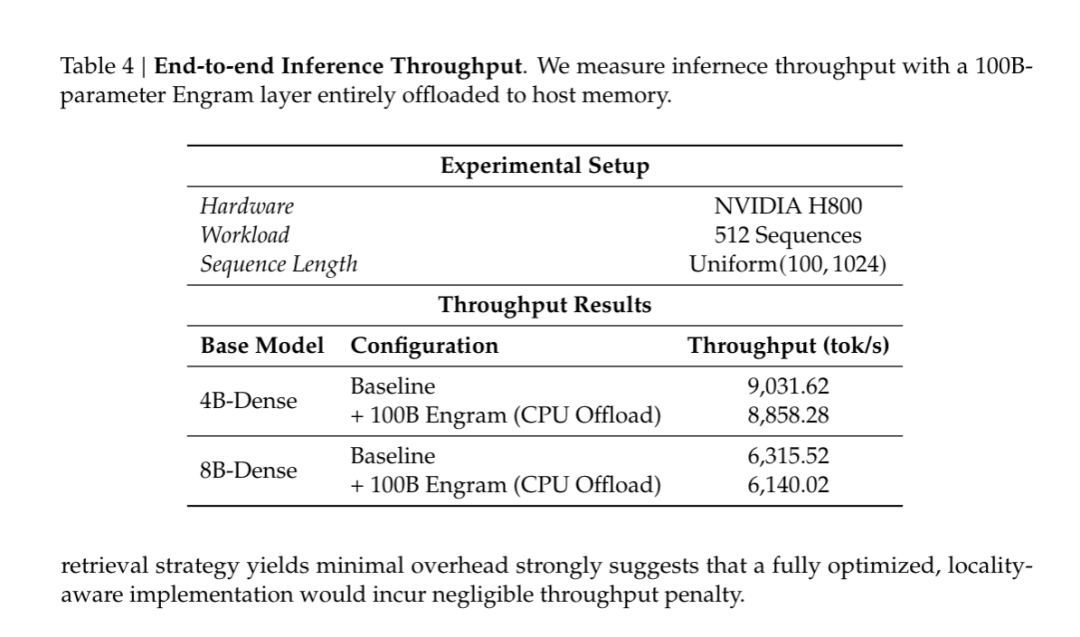 实验直接把一个 1000 亿参数的 Engram 表放到 CPU 内存,在 H800 上跑推理。4B 密集模型的吞吐量从 9031 token/s 降到 8858 token/s,8B Dense 模型从 6315 token/s 降到 6140 token/s,额外开销都在 3% 以内。