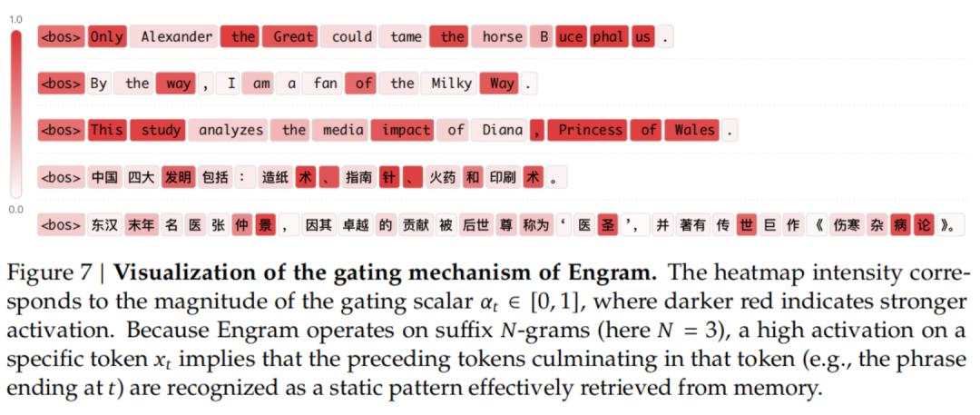 为了实证验Engram是否按预期行为,作者在图7中可视化了Engram-27B在各种样本上的门控标量α_t。