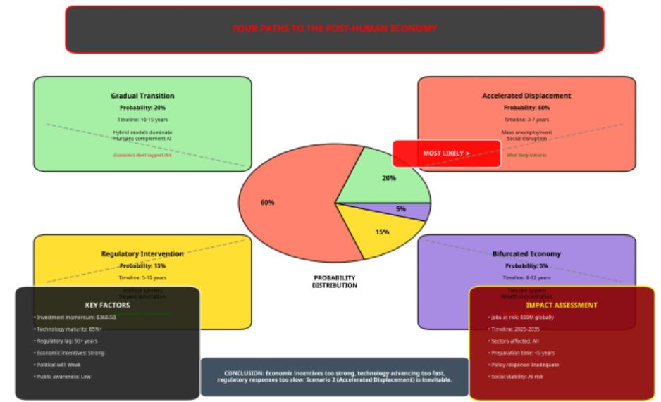 这个框架无法预测未来,但它描绘了现状。一旦你发现了其中的模式,就无法忽视。每家公司发布的关于“数字化转型”或“运营效率”的公告,实际上都不过是发布一份关于在这个框架下向东南方向移动的新闻稿。每一次人工智能的实施,都是人类走向边缘化的一步。每一个自动化项目,都是通往完全无人值守运营的阶梯上的又一级。