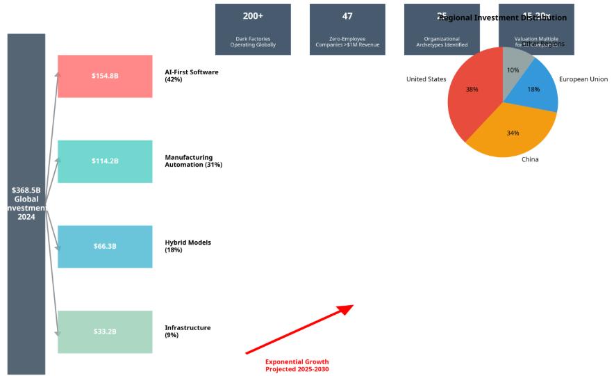 资金正以前所未有的速度流向人力替代领域。仅2024年一年,投资额就高达3685亿美元。投资模式揭示了全球经济的真正优先事项:近一半的无人经济投资流向了人工 智能软件公司——这些公司旨在无需人类员工即可运营;另有三分之一的资金流入了制造业自动化领域,这将导致工厂工作岗位的消失。