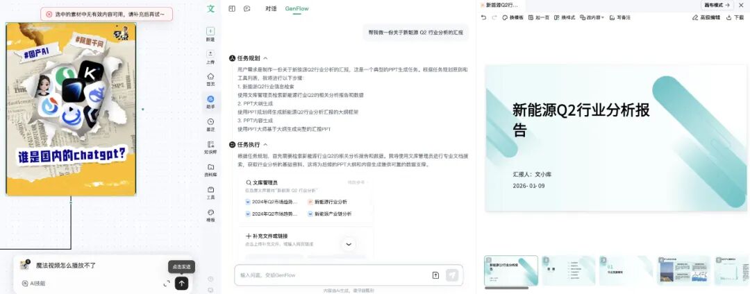(图左:自由画布生成魔法视频图右:行业报告PPT生成)
