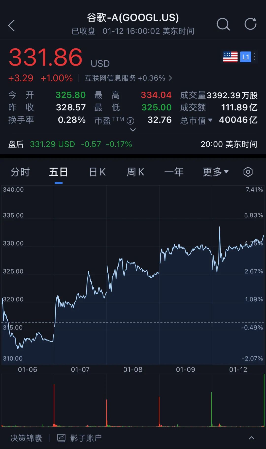 ▲谷歌近5日股价走势(图源:腾讯自选股)