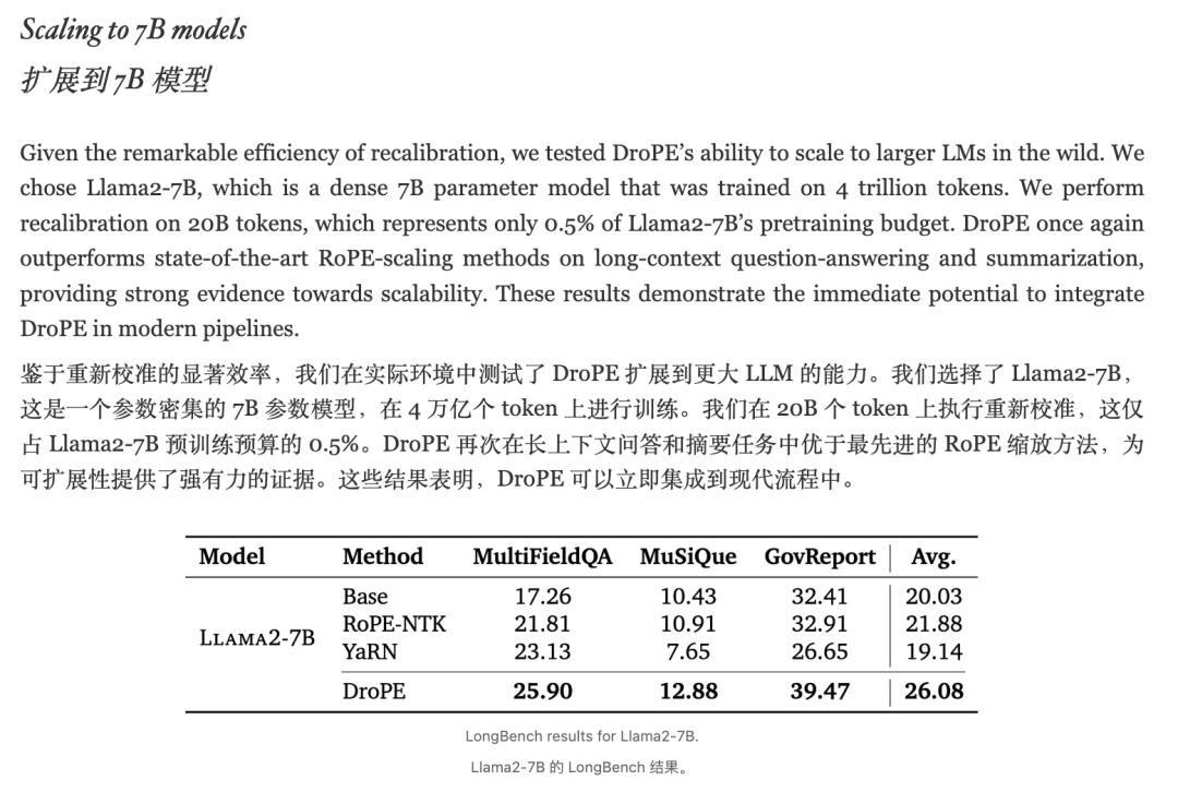 即使在大规模的Llama2-7B模型上,仅使用0.5%的预训练预算进行重新校准,DroPE也能在长上下文问答和总结任务中展现出卓越的性能。