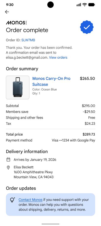 一旦你点击确认购买,Agent将继续通过UCP接口调用商家的下单API,并使用你已授权的Google Pay完成下单。