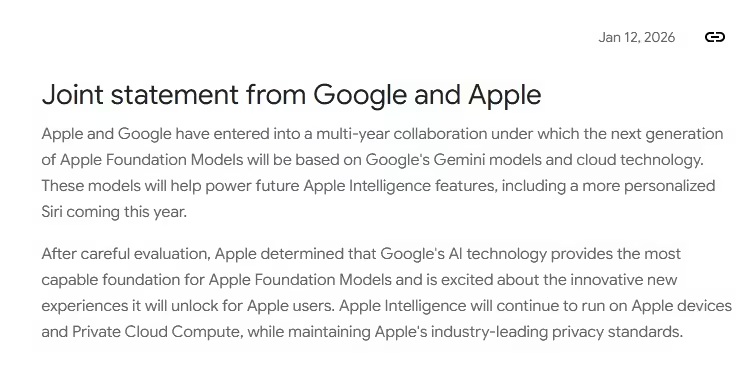 就在昨天,2026年1月12日,科技圈发生了一件足以载入史册的大事:苹果和谷歌,这两家在硅谷斗了十几年的死对头,正式官宣“领证”了。