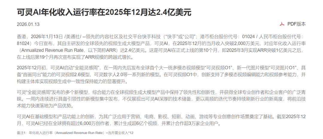 1月4日消息,昨日快手科技宣布,可灵AI 2025年12月的当月收入突破2000万美元,对应年化收入运行率(简称ARR)达2.4亿美元。