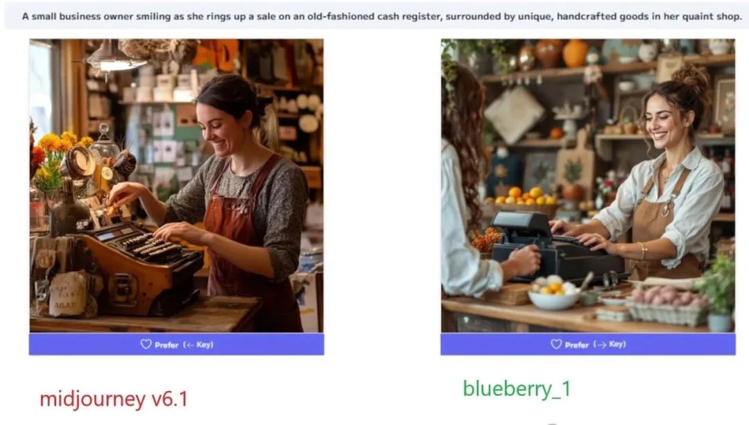 比如和 Midjourney v6.1 对比,blueberry_1 在细节和真实性上更好。