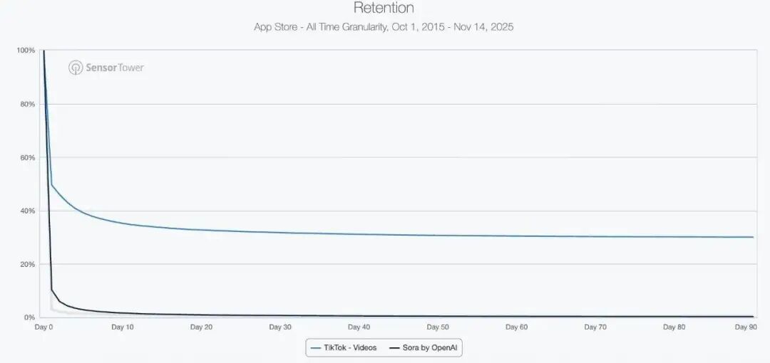 比如 Sora 2 刚发布时被吹捧为短视频的降维打击,5 天内下载量破百万,但 a16z 合伙人 Olivia Moore 抛出的数据却显示,用户的 30 天留存率仅 1%,60 天直接归零。