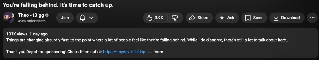 Theo的判断很直接:现在开始适应AI的人,已经是officially late(正式迟到)了。