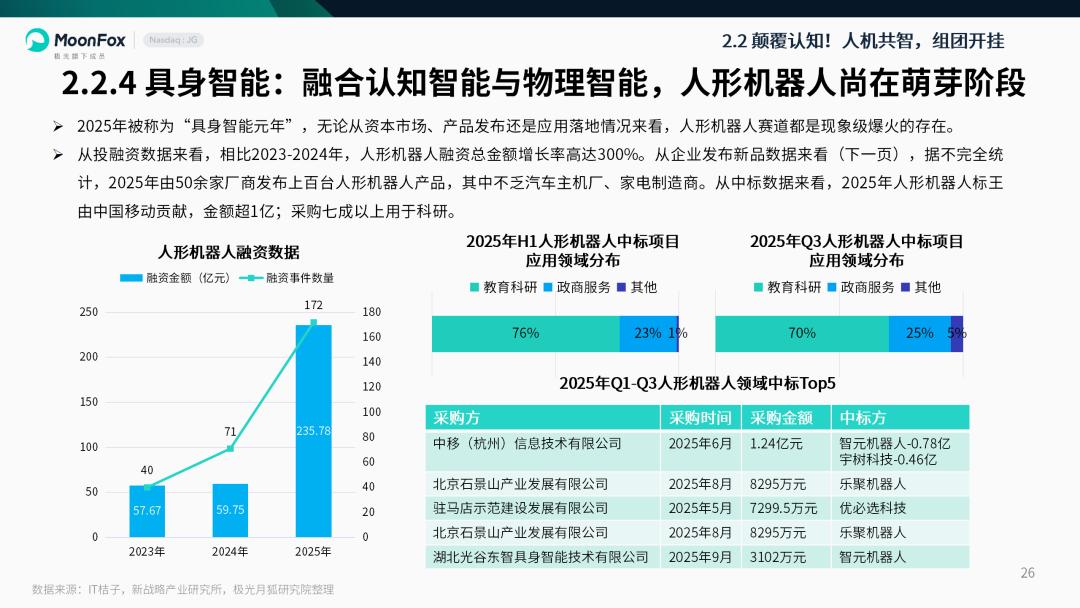 月狐数据发布的《2025年互联网年度盘点研究报告》显示,超50家企业发布上百款人形机器人产品,覆盖工业、家用等多场景;智元机器人、乐聚机器人等头部企业占据2025年Q1-Q3政企采购中标前列,成为赛道核心供应商。