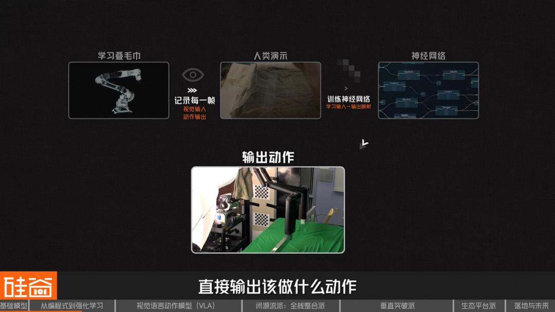同样以叠毛巾为例,机器人模仿学习会这么做:让人类演示很多次怎么叠毛巾;记录下每一帧的视觉输入和动作输出;训练一个神经网络,学习输入→输出的映射;机器人看到毛巾,直接输出该做什么动作。