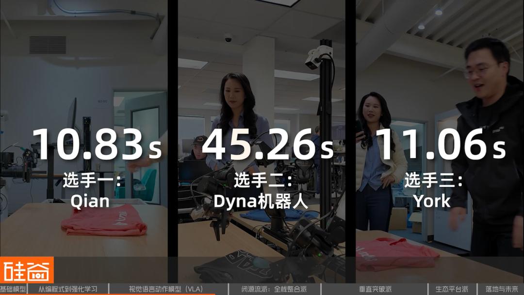 我们也和机器人以及和York比拼了一下手速,虽然在叠衣服这件事情上,我俩都比机器人快,但说实话我觉得我俩真不一定有Dyna的机器人叠得好。并且,关键点在于:机器人虽然目前还比较慢,但它可以7*24运作,还不用休息,只要经济账算得过来,落地就是可行的。