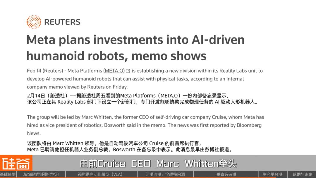 Meta的策略类似但更低调。2025年初,Meta在其Reality Labs旗下组建了一个新机器人部门,由前Cruise CEO Marc Whitten牵头,目标是开发类人机器人平台。Meta CTO Andrew Bosworth曾公开提到,其团队正在构建一种“world model”,以支撑机器人完成比“行走”和“跑跳”更细致的操控动作。