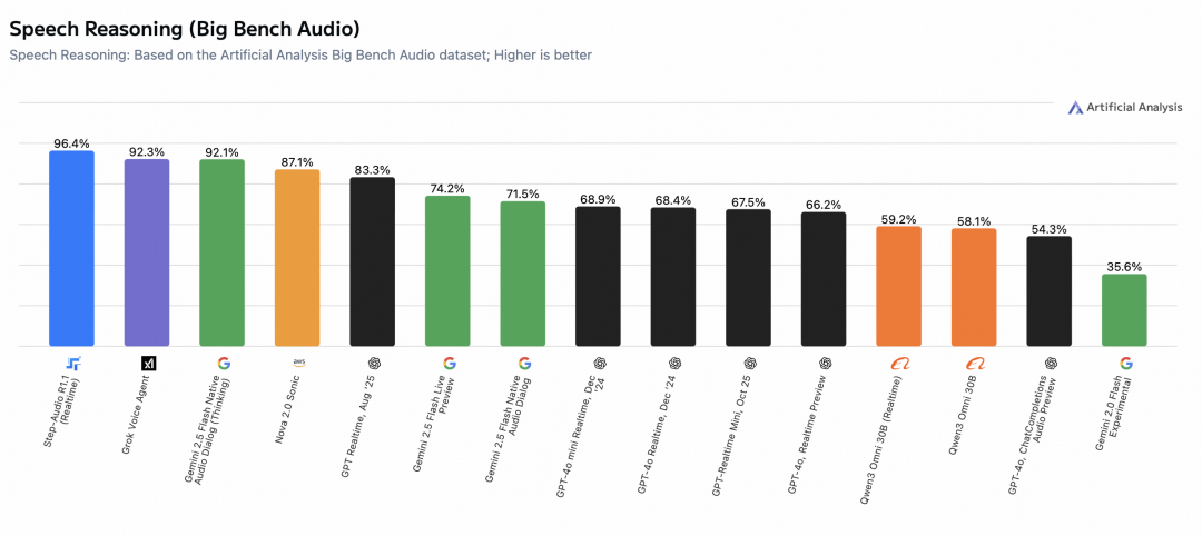 阶跃星辰称,全球知名权威大模型评测榜单 Artificial Analysis Speech Reasoning 更新,阶跃星辰原生语音推理模型 Step-Audio-R1.1 登顶榜首。该榜单是目前业界评估“原生语音模型”(Native Audio Models)最权威的第三方基准之一。核心考量模型直接处理音频并进行复杂逻辑推理的能力,主要考察维度包括准确率、首包延迟等。
