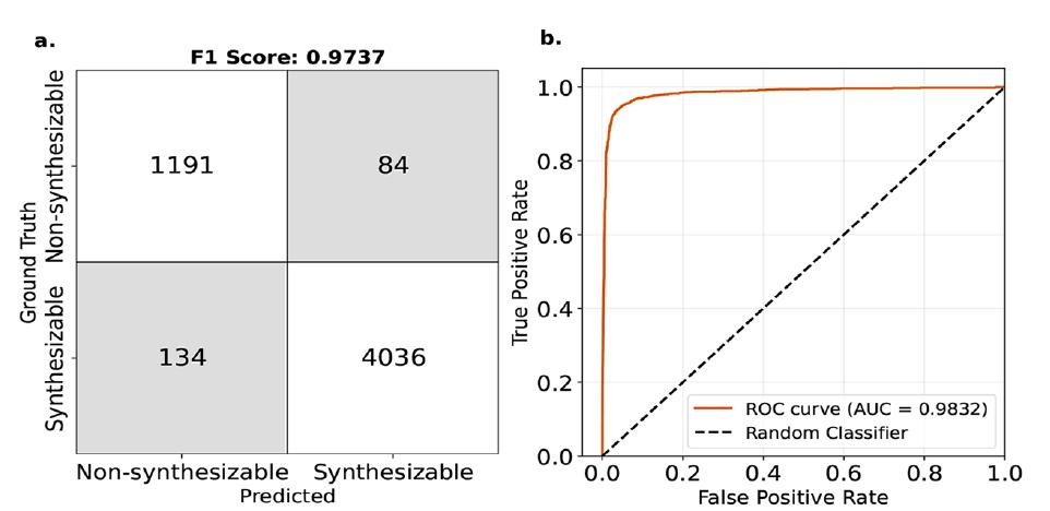 * ROC 曲线下面积(AUC)高达 0.98——最终可以理解为,如果模型判断某 MOFs 可合成,该评估错误的概率仅约 2%。
