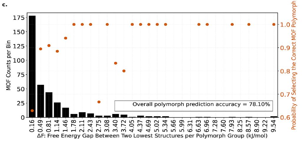 对于存在多晶型的 MOFs 系统,实验进一步验证了模型识别最稳定多晶型的能力。在 7,490 个多晶型家族中,每个家族包含 2–50 个晶型,模型能够在自由能差异仅 0.16 kJ/molMOFatom 的情况下正确选出最稳定的晶型,其成功概率约 63%;当自由能差异增大至 0.49 kJ/molMOFatom 时,成功率提升至 89%。