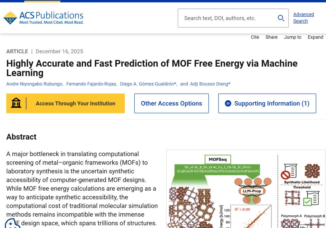 相关研究成果以「Highly Accurate and Fast Prediction of MOF Free Energy via Machine Learning」为题,已刊登 ACS Publications。