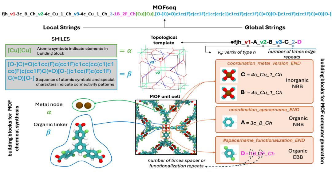 在 MOFSeq 中,局部信息主要包括构建单元的原子组成及其内部连接信息;全局信息主要包括 MOFs 构建单元的高层次描述及构建单元之间的连接模式。局部信息通过 MOFid 工具获取,而全局信息则依赖 ToBaCCo-3.0,如下图: