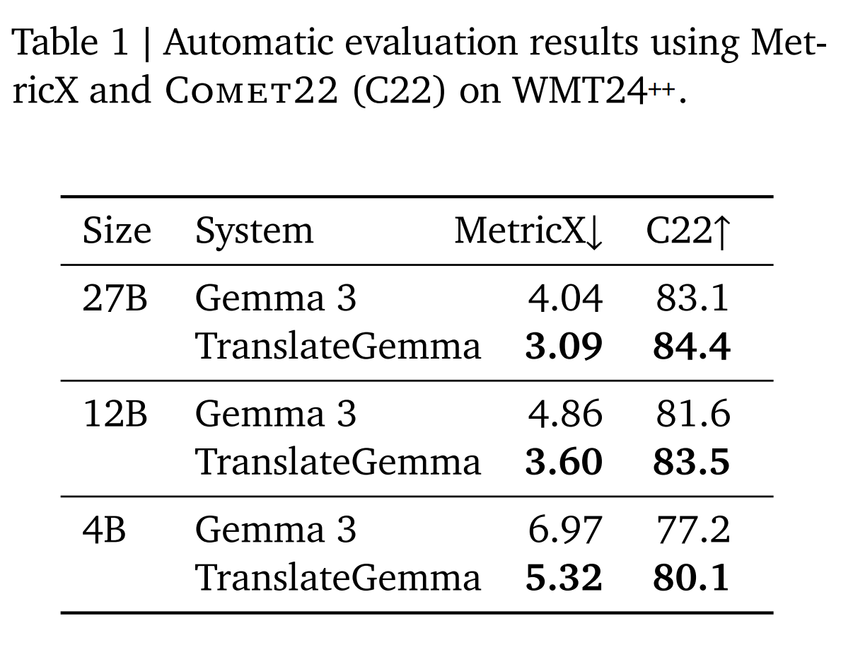 首先是监督微调(SFT),Google 利用 Gemini 模型生成的高质量合成数据与人工翻译数据混合,对 Gemma 3 底座进行训练;随后引入强化学习(RL)阶段,通过 MetricX-QE 和 AutoMQM 等先进奖励模型,引导模型生成更符合语境、更自然的译文。