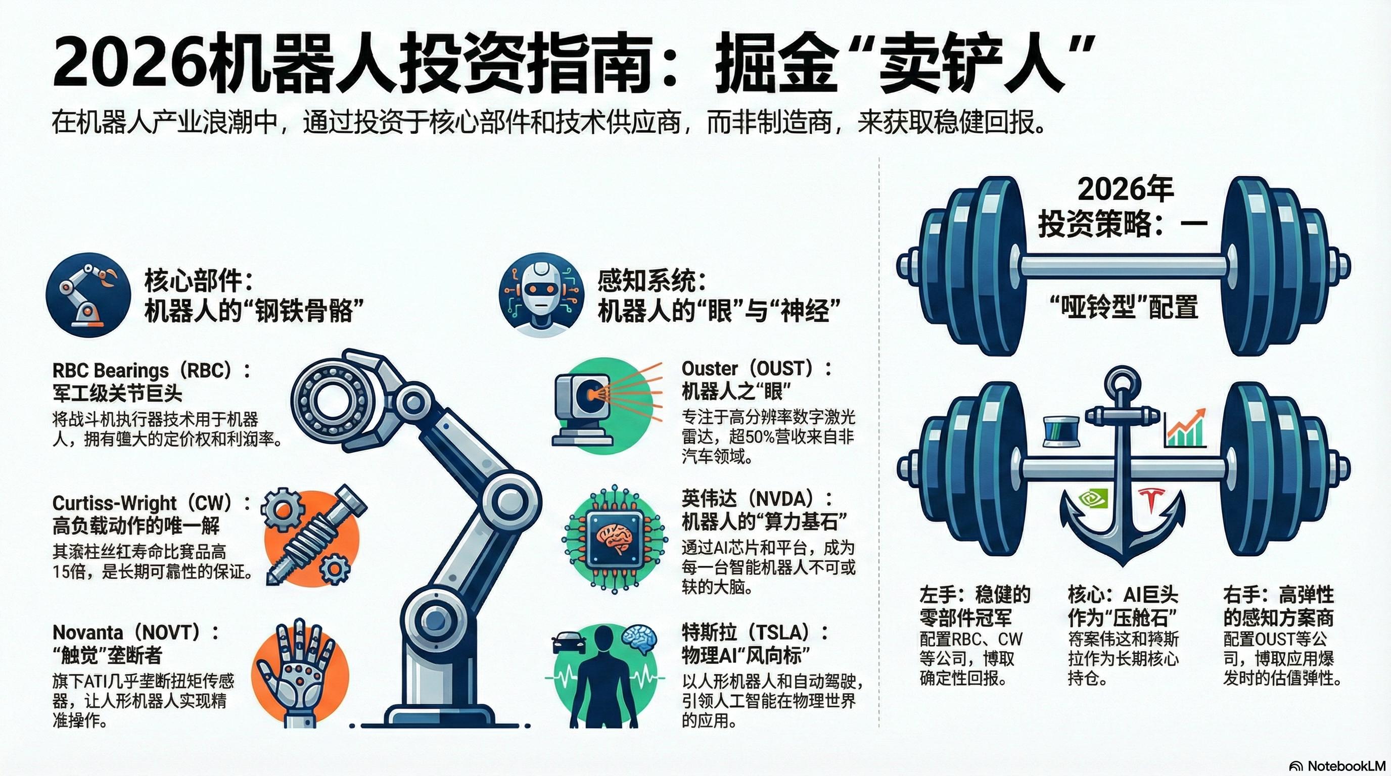 RockFlow 投研团队认为,2026 年的机器人持仓应保持“哑铃型”结构:左手握住 RBC、CW 这种高毛利、现金流稳健的零部件冠军,博取确定性回报;右手配置 OUST 这种感知类标的,去博应用爆发时的估值弹性。此外,英伟达、特斯拉这两大物理 AI 巨头,也适合作为压舱石。